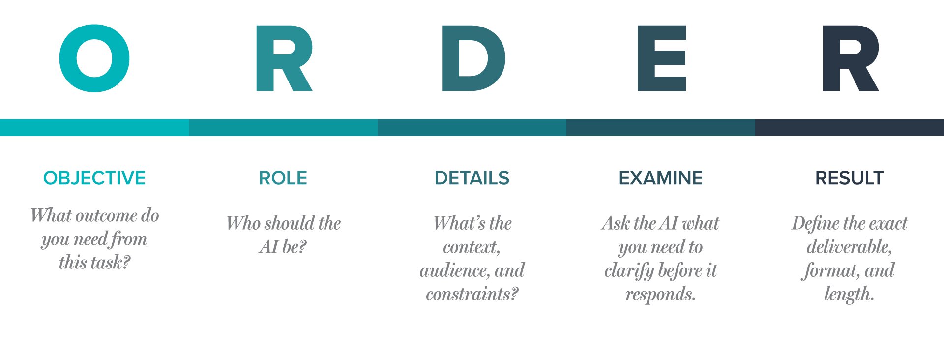 The performance of Large Language Models (LLMs) — such as ChatGPT, Claude, and Gemini — largely depends on how users ask questions or assign tasks to the AI. This is known as prompting or prompt generation. ORDER is a five-step framework built for parliamentary staff to assist with building stronger prompts and improving the usefulness of commercially available LLMs..