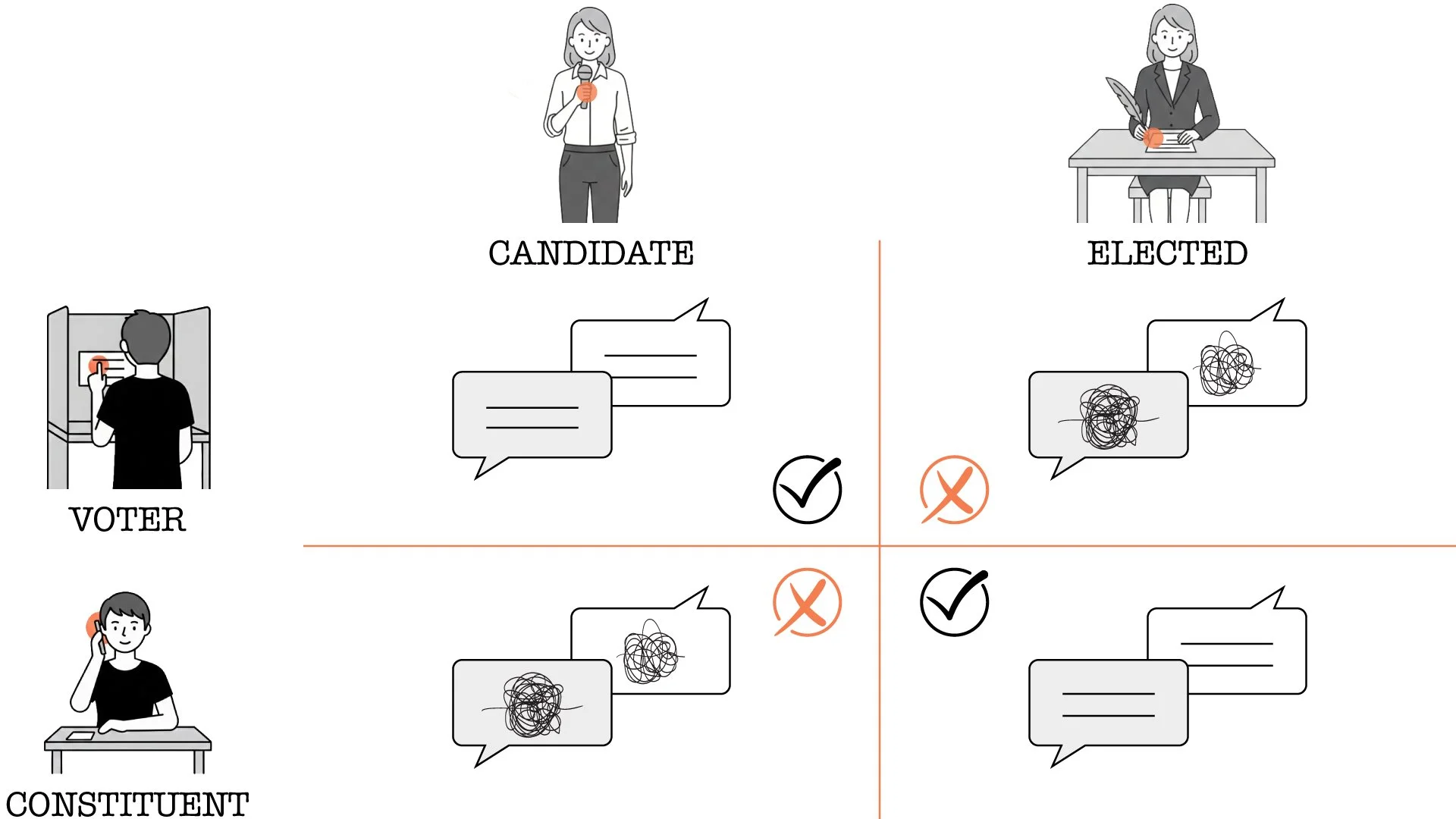 On the other axis, we have two corresponding roles for the public: “constituent” — the group of people represented by a specific elected official, including non-citizen residents — and “citizen/voter” — the group of people with political power to participate in elections.