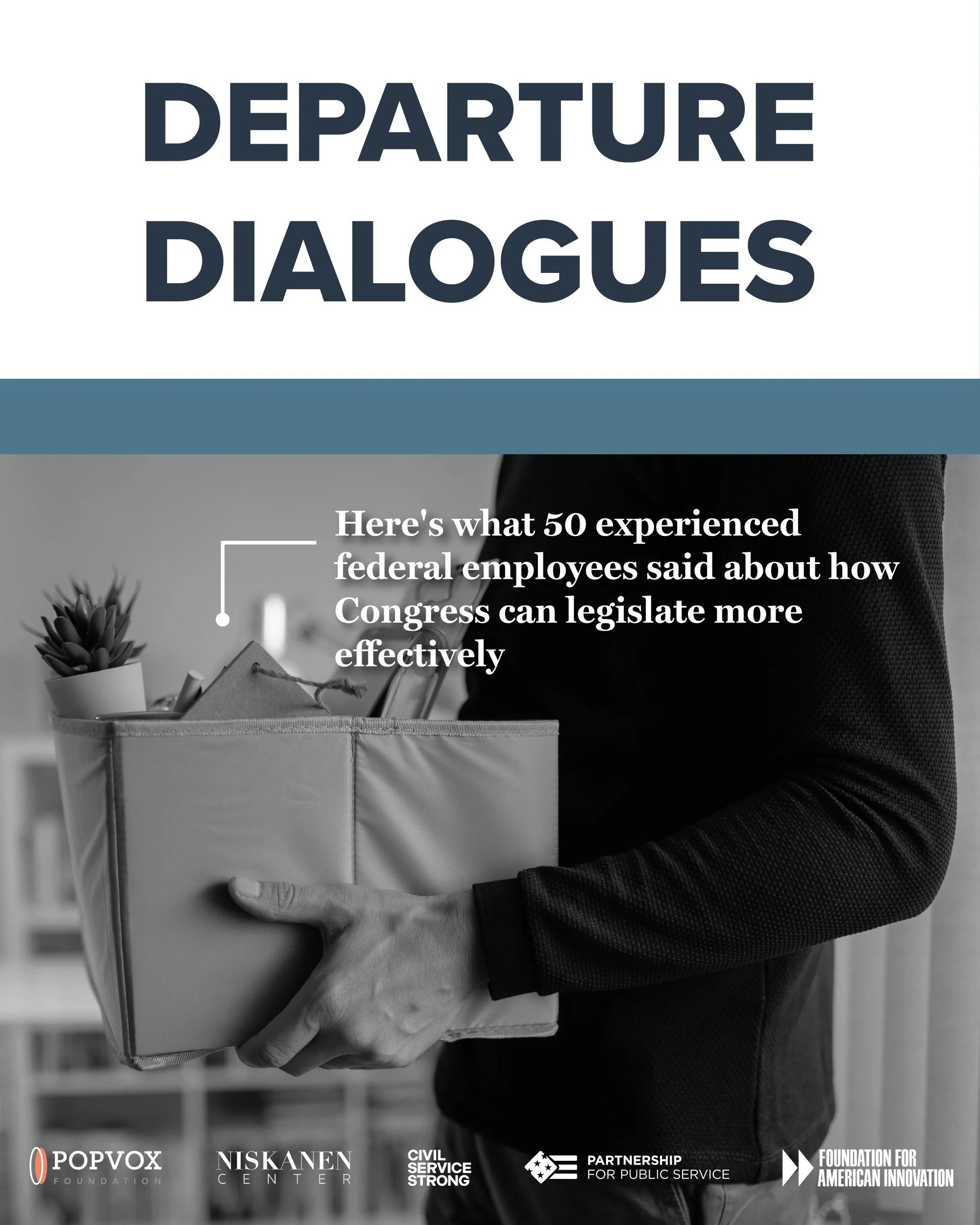 That is the central finding of Departure Dialogues, a new report released today by POPVOX Foundation and a coalition of nonpartisan partners — the Foundation for American Innovation, the Niskanen Center, the Partnership for Public Service, and Democracy Forward’s Civil Service Strong. The report documents on the record — with named sources and specific laws — where Congressional intent breaks down in practice, as told by the career federal employees who spent decades implementing the programs Congress designed. The coalition will review the findings at a Congressional Staff Briefing on May 5 from 1-2 PM ET in the Canon House Office Building 330.