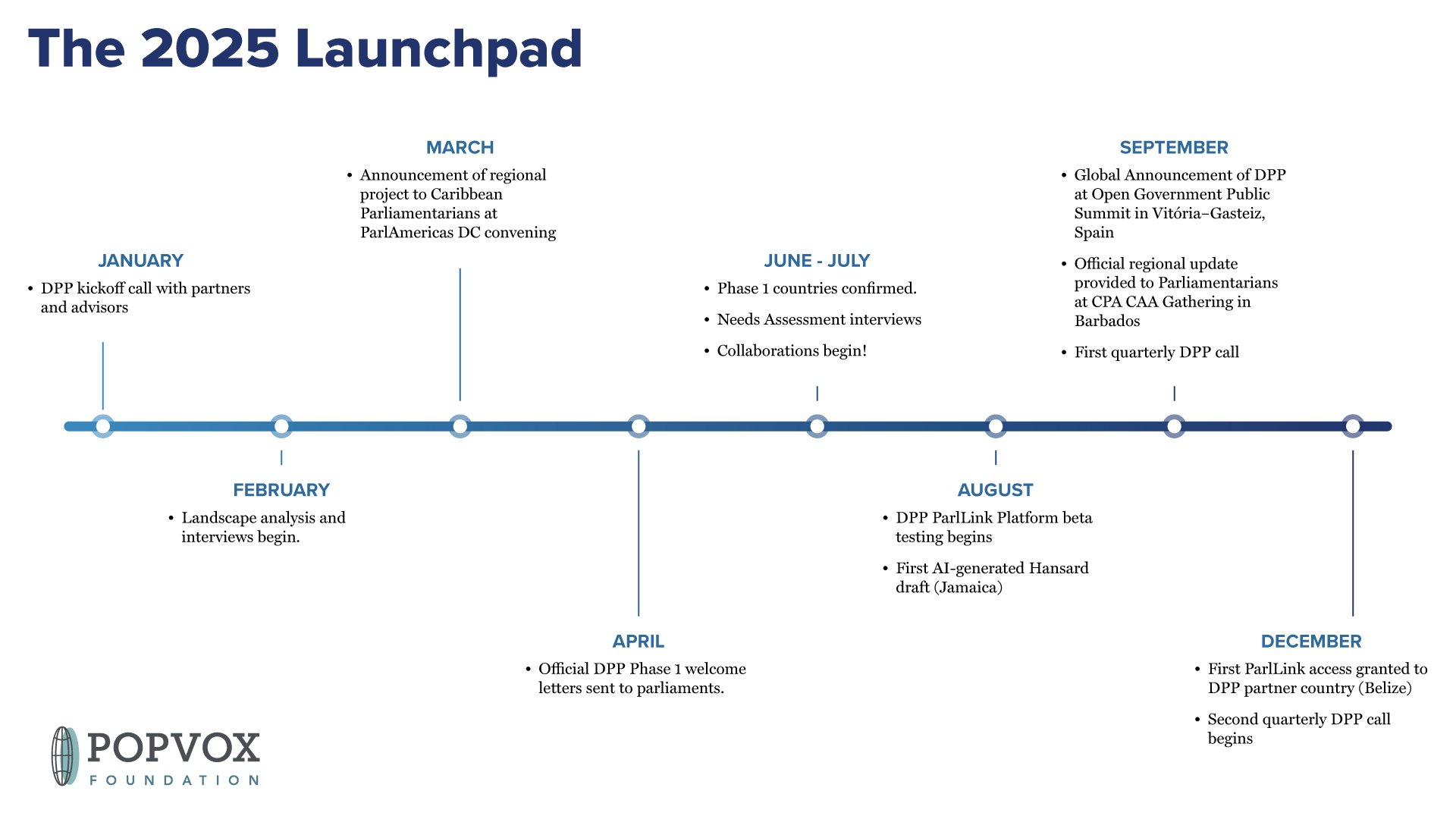 December 2025 brought the virtual ribbon-cutting of ParlLink as we moved into the next phase of beta testing and officially extended ParlLink access to our DPP Cohort 1 partner countries. The National Assembly of Belize became the first DPP partner to receive full ParlLink access, and POPVOX Foundation signed an MOU with Saint Kitts and Nevis, welcoming them into the DPP as an official partner country. We ended 2025 with the second DPP Quarterly Convening where we presented the year in review and began mapping 2026.