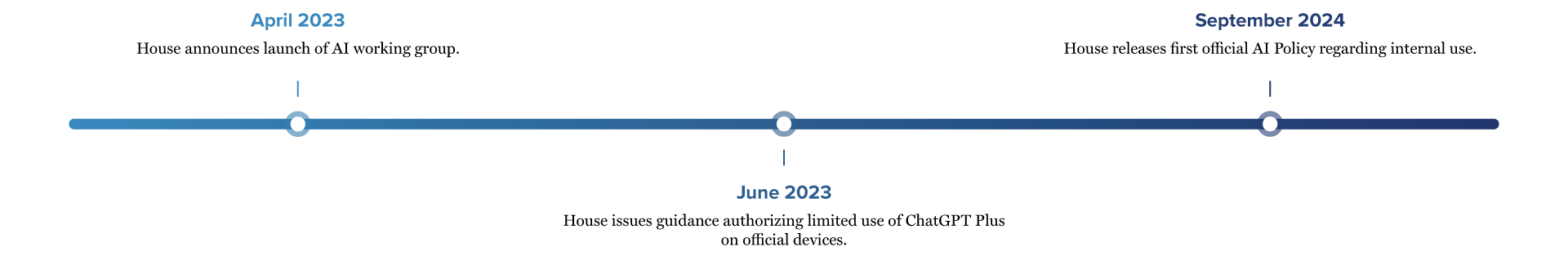 The House’s and Senate’s proactive, transparent approaches to setting institutional guardrails for use of this emerging technology is creating an environment in which innovation can safely begin. It also acknowledges the need for staff and Members who may be considering future regulatory approaches to have an opportunity to work with and understand these new tools. With clear guidance authorizing the use of LLMs, staff can experiment with confidence and assurance that they are operating within the boundaries of authorized activities, and as that policy expands will be able to adjust accordingly.