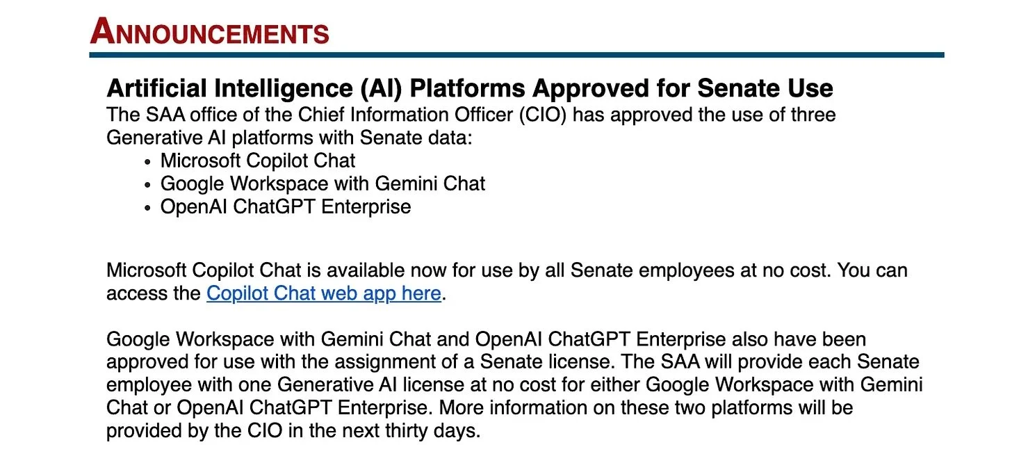 On March 9, 2026, the Senate Sergeant at Arms office of the Chief Information Officer announced that three AI tools are authorized for use with Senate data. These include: