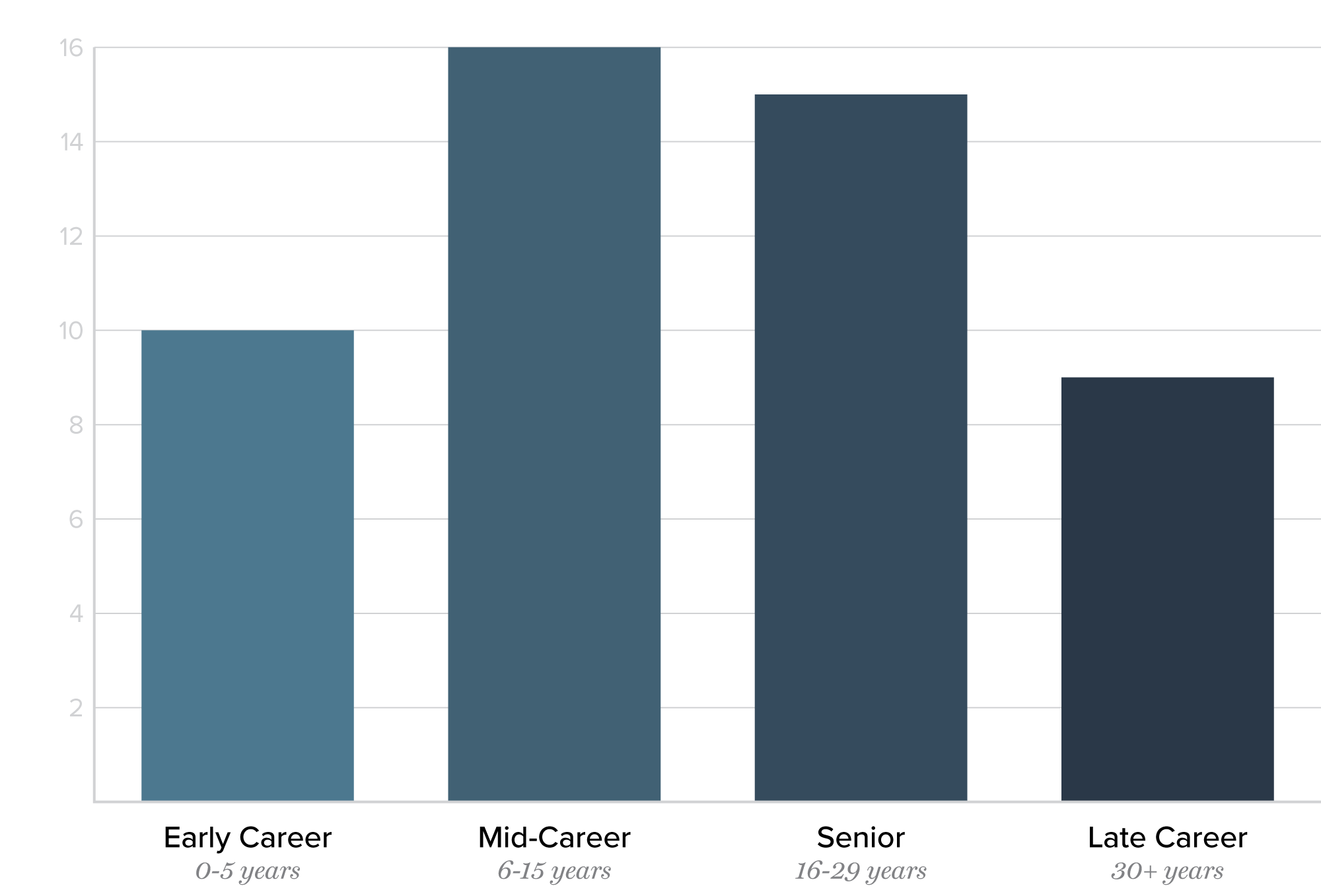 The participant pool skewed toward experience. Total government service ranged from under one year to 40 years, with an average of 15 years overall and 14.3 years at participants’ most recent agency. Participants fell into four broad seniority tiers: 10 were early-career (0–5 years), 16 were mid-career (6–15 years), 15 were senior (16–29 years), and 9 had served 30 or more years. Nearly half of all participants had 16 or more years of service, and the 9 longest-serving participants each brought three decades or more of institutional experience. This seniority profile suggests that while the proof of concept drew a relatively small sample, it reached people with deep firsthand knowledge of how federal agencies function — and, in many cases, how they have changed over time.