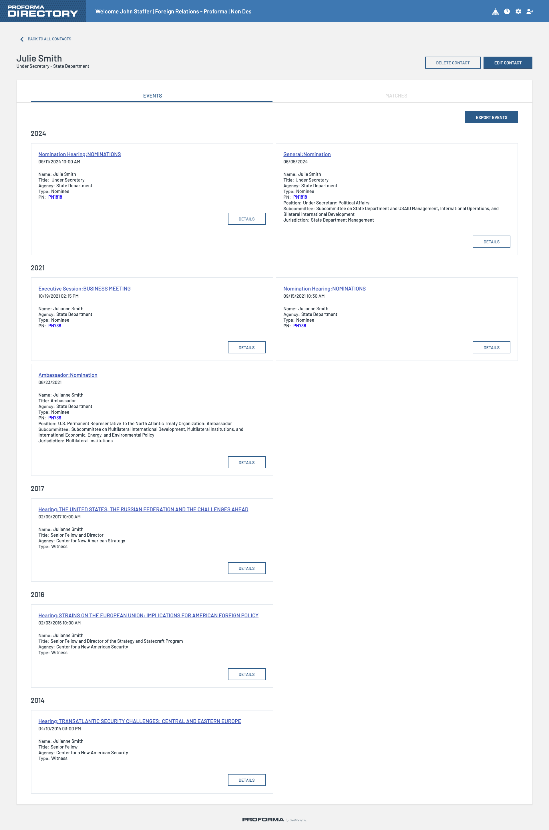 ProForma's centralized data structure also benefits entities beyond committee staff. The Congressional Research Service can access agency reports as they are submitted to committees rather than waiting for public posting. Senate archivists receive structured data exports at the end of each Congress instead of requiring committee staff to manually compile information from scattered documents and spreadsheets. This process previously required weeks of effort from both committee staff and archivists.