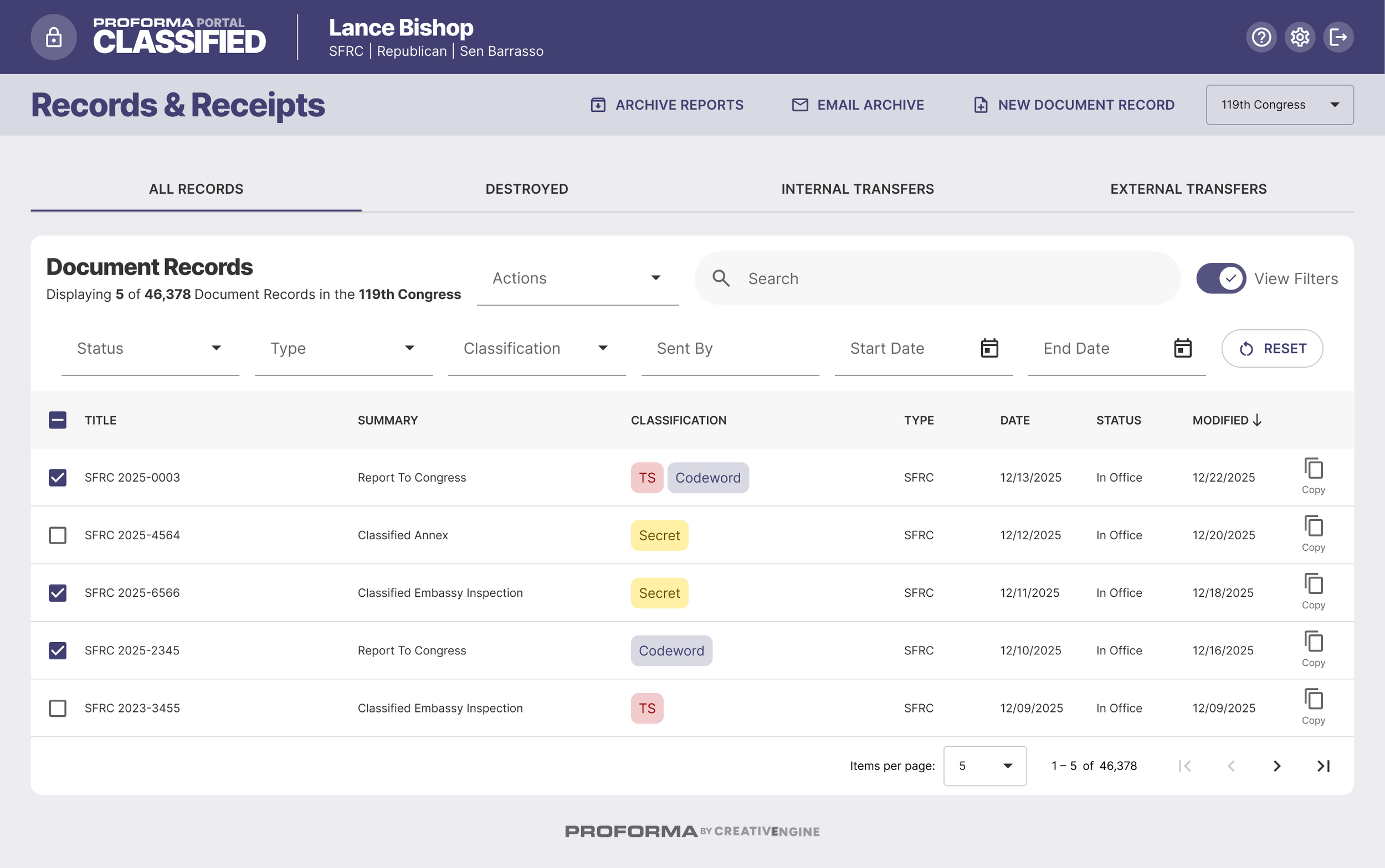 The classified module handles the specialized workflow of classified document management, tracking materials through their entire lifecycle: from receipt, through Senate Security, to storage in committee vaults or SCIFs (Sensitive Compartmented Information Facility), to eventual transfer to the National Archives or destruction. Staff can download cover sheets, track when documents are transferred in and out, and manage the chain of custody.