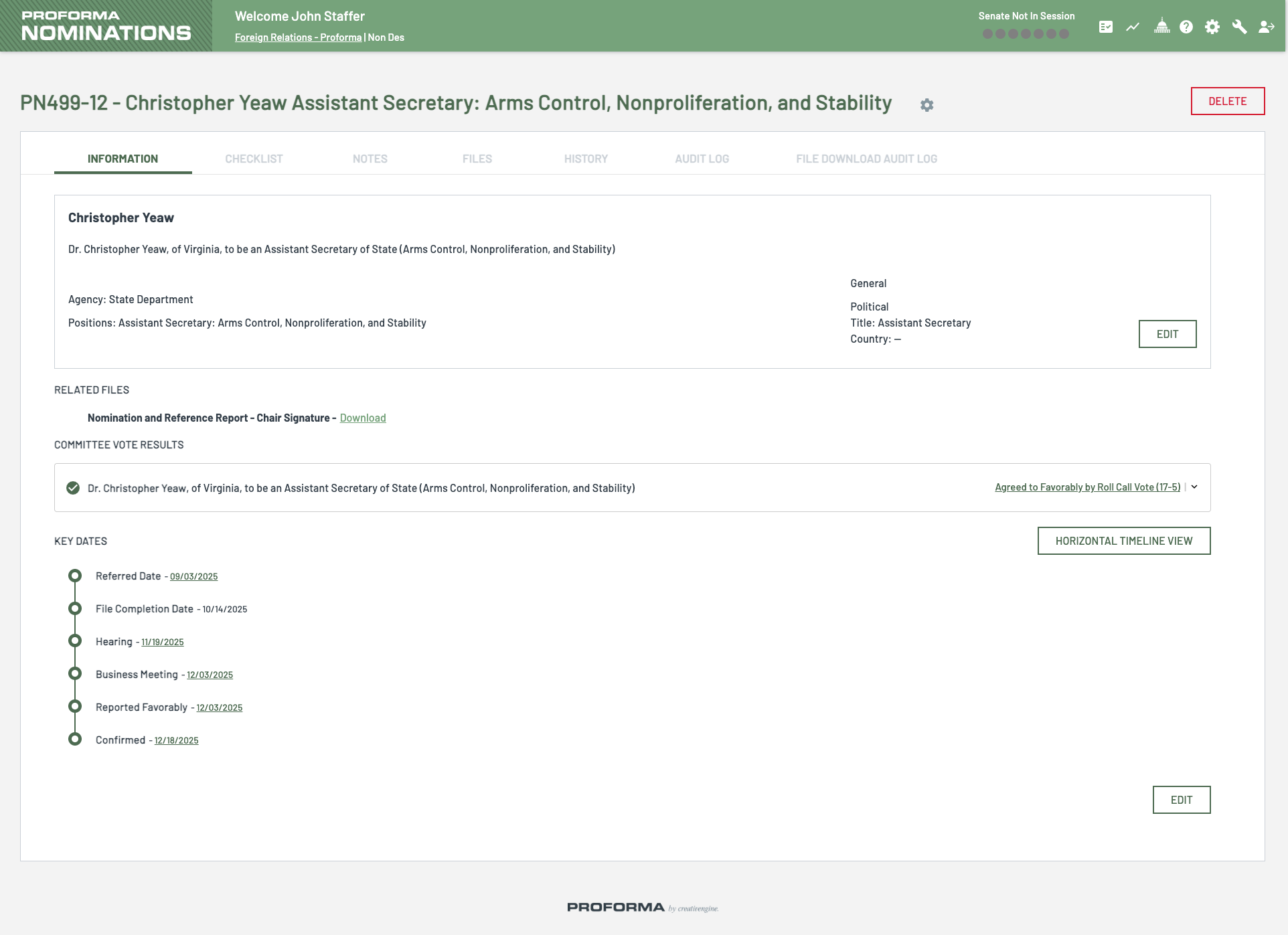 For committees that handle nominations, Proforma includes a nominations module with Congress.gov integration. Committees can choose automatic imports or manual import by Presidential Nomination number, which gives staff more control over how the nomination is initially entered.