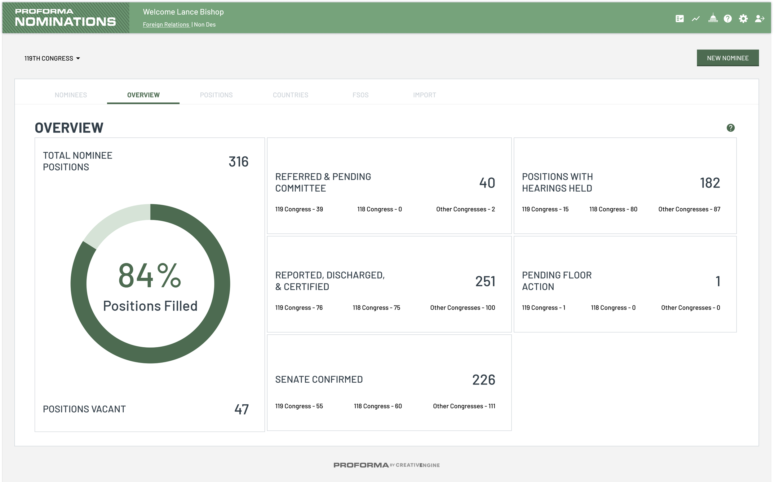 Once nominees are in the system, the overview dashboard gives committees a high-level view of their entire portfolio: how many total positions they manage, what percentage are filled, and how many nominees are at each step of the process. The dashboard breaks this down by current Congress, previous Congress, and earlier – relevant for tracking five-year terms.