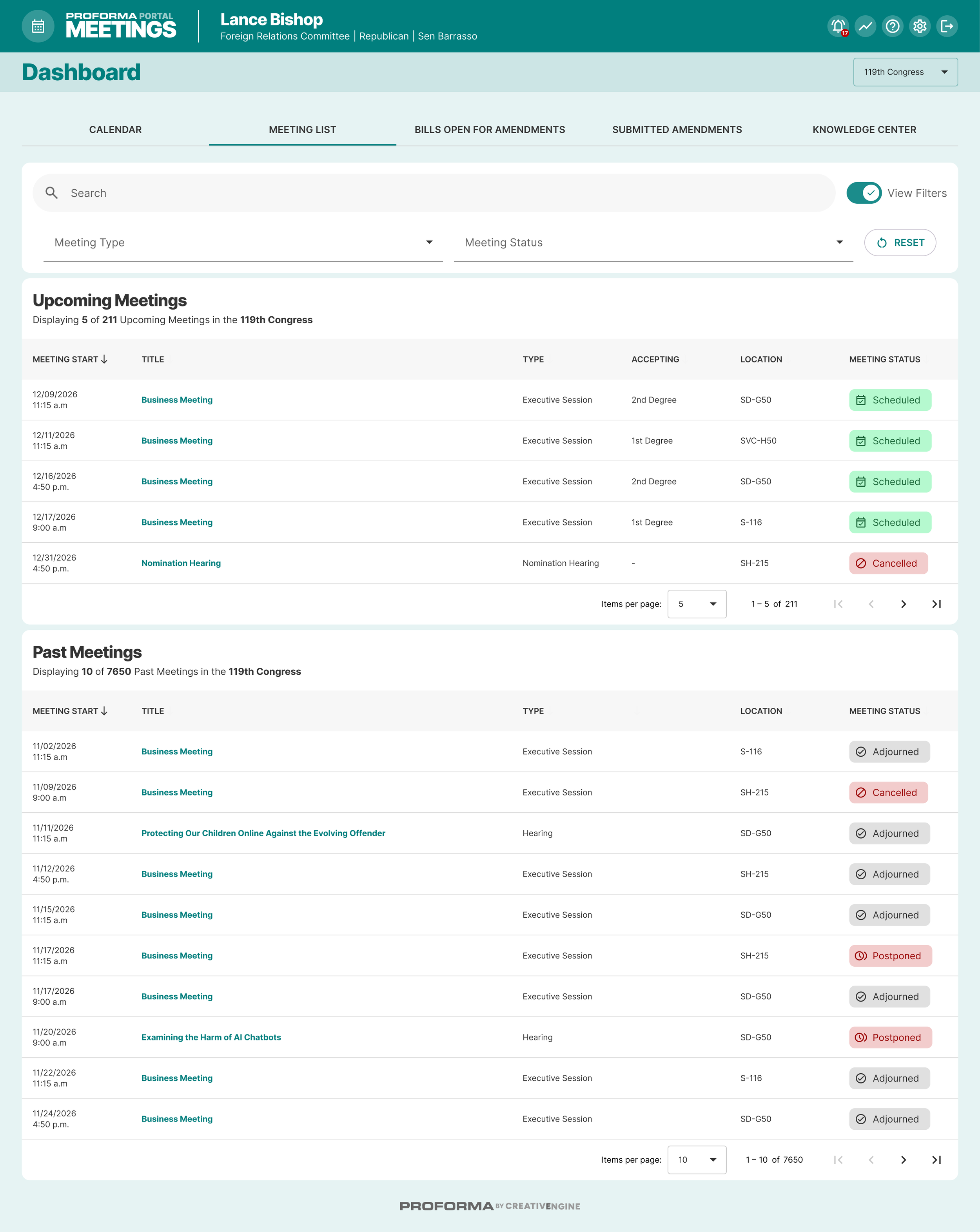 Proforma is a highly configurable, comprehensive legislative workflow management platform for Congressional committees that handles meeting scheduling, amendment tracking, nomination processing, document management, and committee communications in a single integrated system.