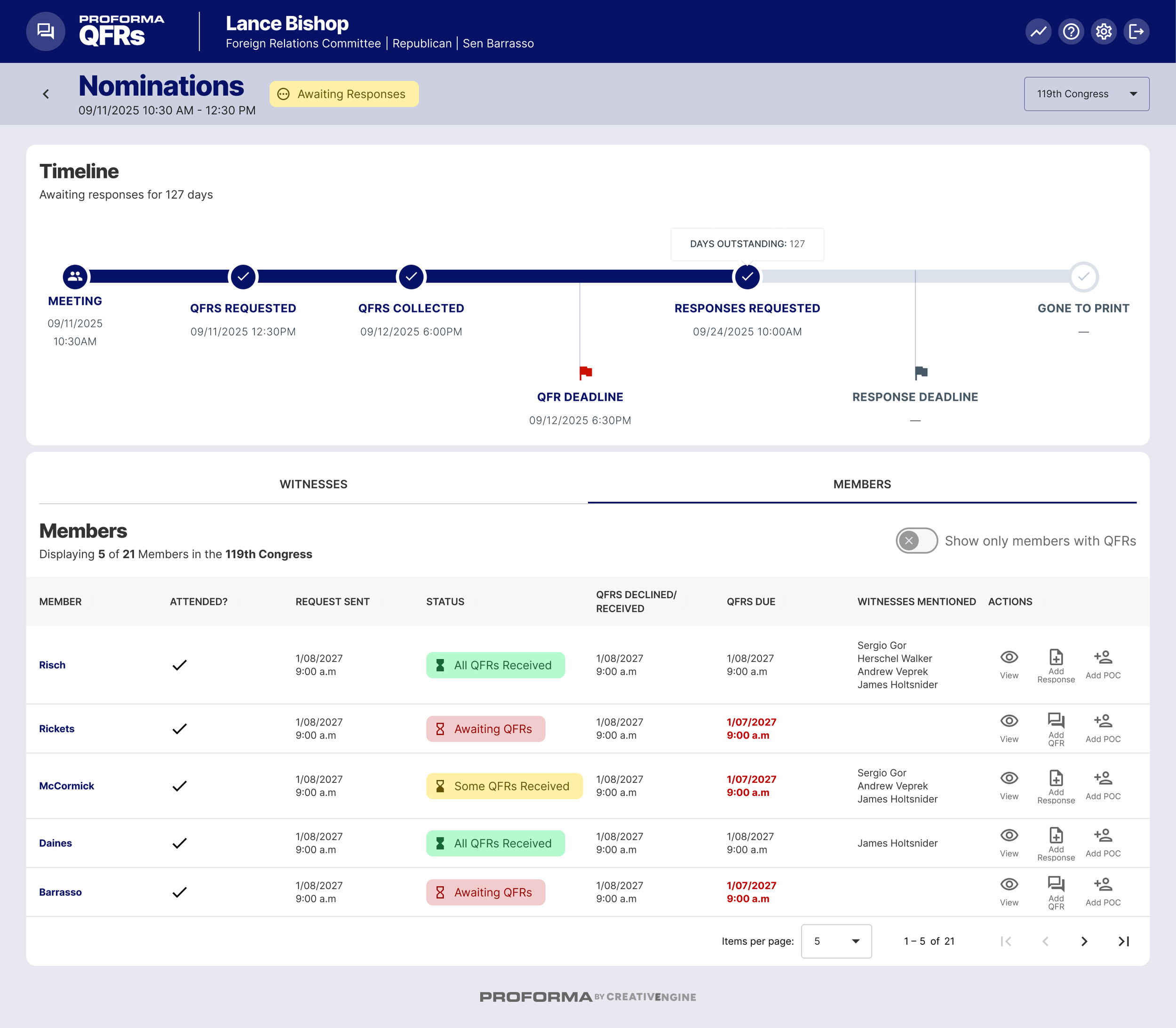 QFRs (Questions for the Record): Tracks the post-hearing question and response process